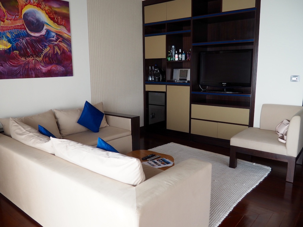 Villa’s indoor space features a massive pool, a huge daybed, an outdoor shower and a seating area. We loved to take a dip in the pool and enjoy the sun on the lounge bed. It has a sunken living area with a large, comfortable sofa and large king size bed. The heart of the villa is the open Jacuzzi in the middle of the living area. It features a huge freestanding bathtub for two, an indoor shower and two sinks and mirrors.