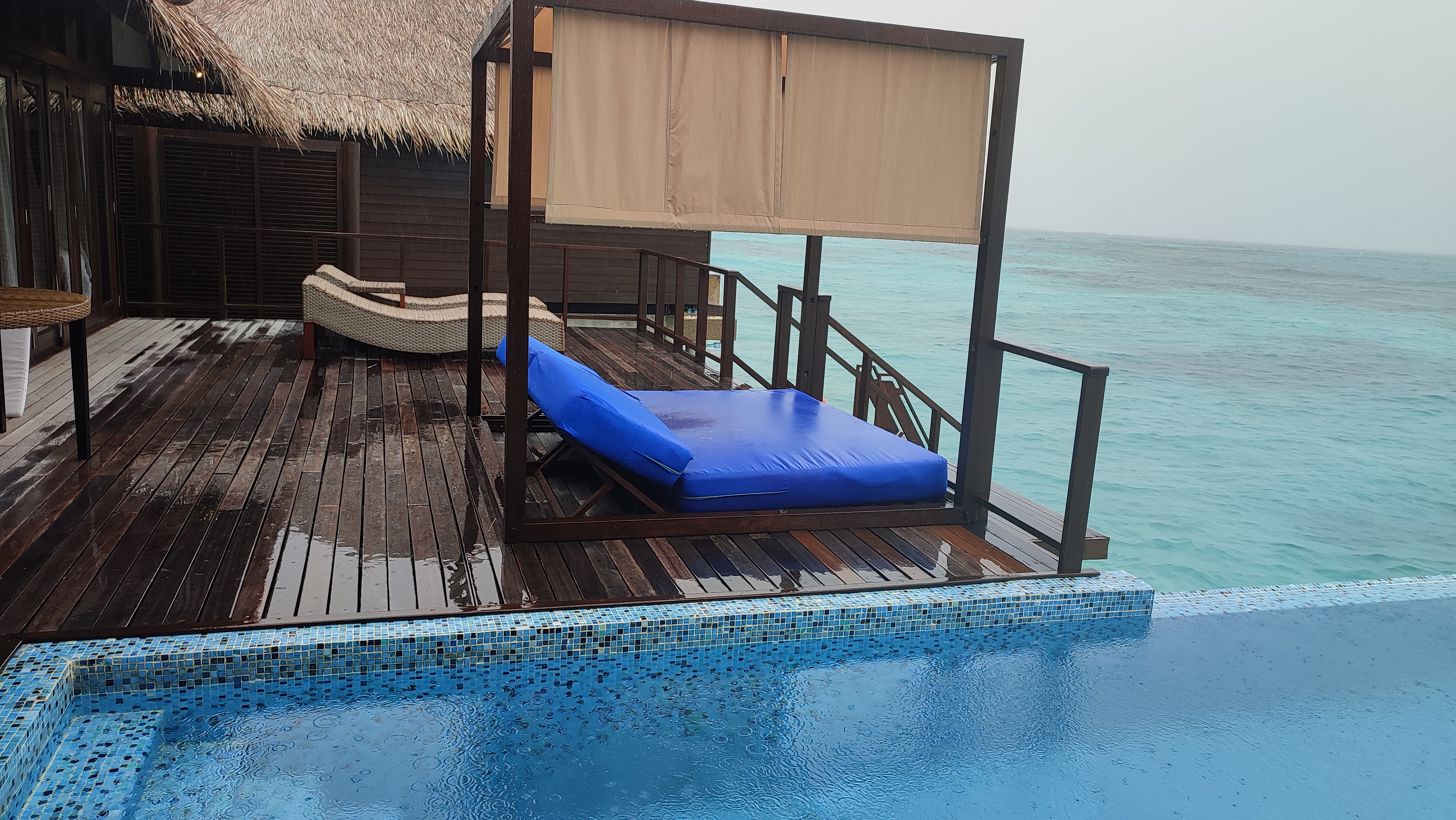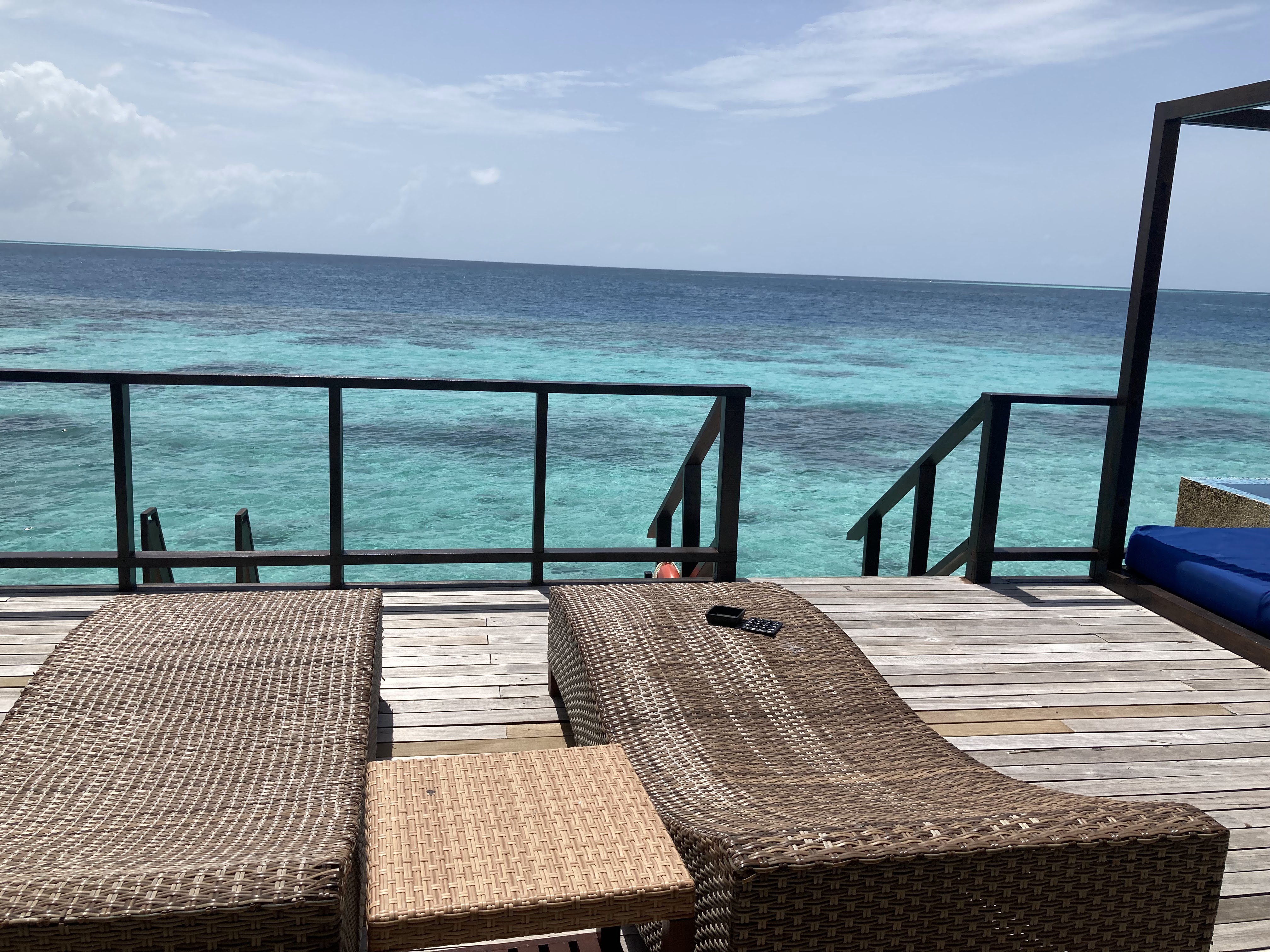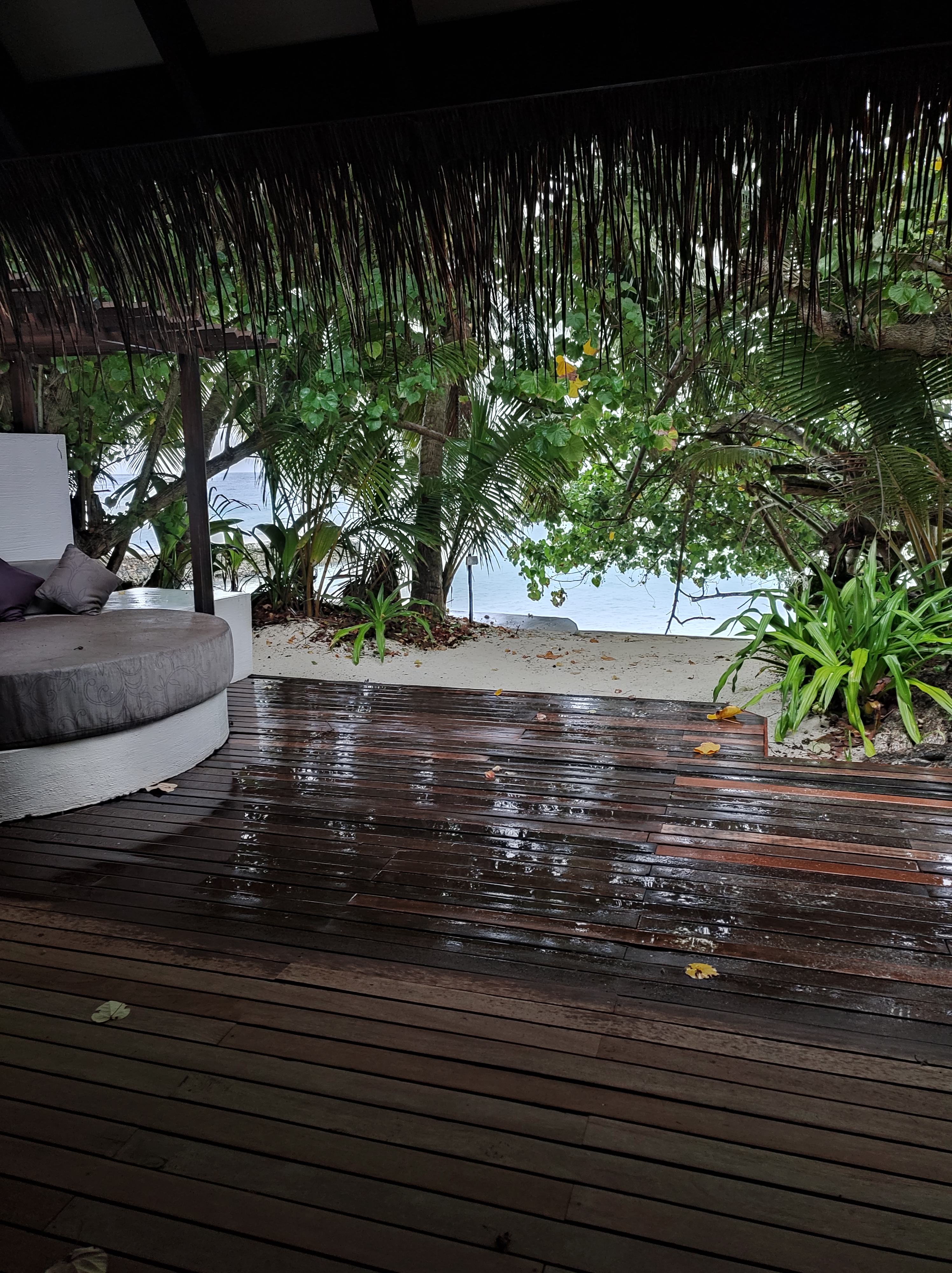 The spacious outdoor deck offers a lounge area, a seating area, sunbeds and direct beach access. Unfortunately, we barely had a beach section in front of our villa. The beach access had to be secured by tree and View point.